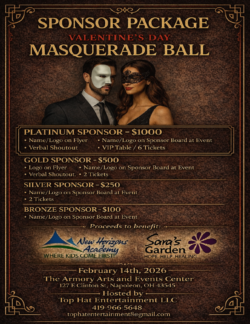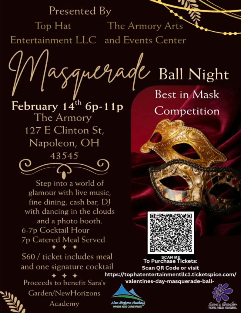 Celebrate love, mystery, and elegance at a Valentine’s Day Masquerade Ball on February 14, 2026, from 6:00 PM to 11:00 PM at The Armory Arts and Events Center in Napoleon, Ohio. Step into a world of glamour—where masks shimmer, music fills the air, and unforgettable memories will be made.